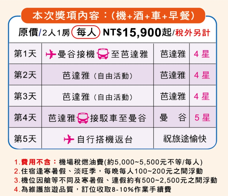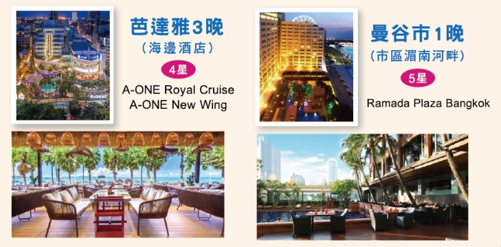 5天來回泰航機+酒/全程4星+5星(含早餐)/芭達雅來回免費接駁車