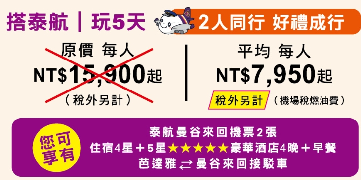 「泰航機+酒五天四夜自由假期扣抵」