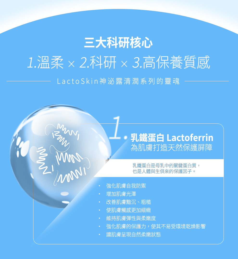 乳鐵蛋白神泌露結合高純度乳鐵蛋白與外泌體技術,由乳鐵蛋白權威黃琇琴博士研發監製,專為舒緩敏感、強化肌膚屏障、淡化細紋打造。以科學實證為基礎,融合天然成分與尖端外泌體應用,實現肌膚由內而外的穩定與透亮。